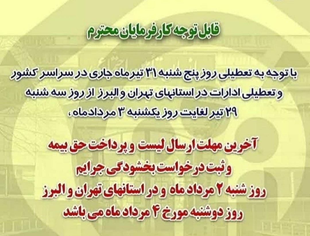 در این اطلاعیه آمده است با توجه به تعطیلی روز پنج شنبه ۳۱ تیرماه جاری در سراسر کشور و تعطیلی اضطراری کرونایی ادارات در استان‌های تهران و البرز از روز سه شنبه ۲۹ تیرماه لغایت روز یکشنبه ۳ مرداد ماه؛ آخرین مهلت ارسال لیست و پرداخت حق بیمه و ثبت درخواست بخشودگی جرایم روز شنبه ۲ مرداد ماه و در استانهای تهران و البرز روز دوشنبه مورخ ۴ مرداد ماه می باشد./ع/