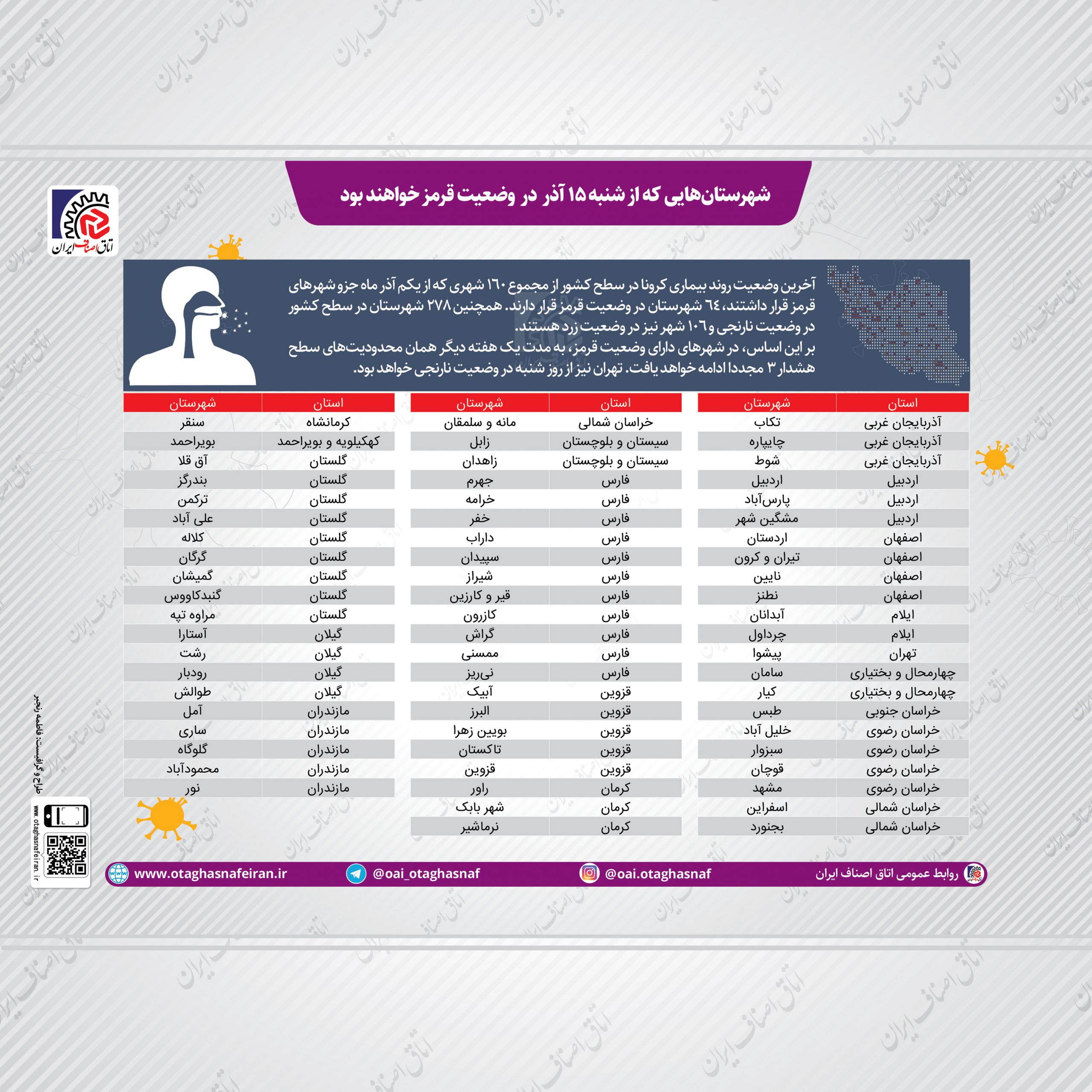 شهرستانهایی که از امروز شنبه ۱۵ آذر به مدت یک هفته در وضعیت قرمز قرار دارند./پ/