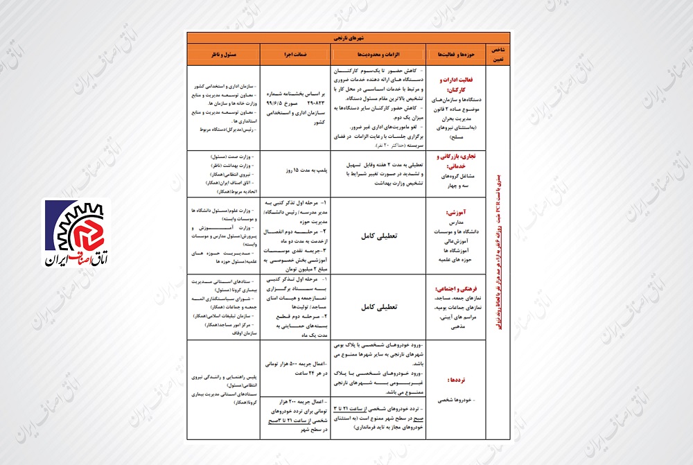 فهرست مشاغل مجاز به فعالیت در شهرهای نارنجی و شرایط و ضوابط فعالیت کسب و کارها به روز شد.
