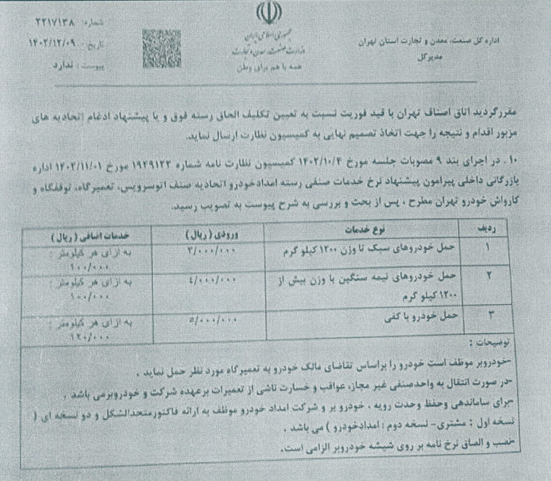 نرخ نامه صنف امدادگران خودرو و یدککشهای استان تهران