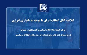 بر این اساس، با توجه به ناترازی انرژی در کشور و لزوم صرفه جویی در مصرف انرژی و همچنین فرا رسیدن ایام دهه فجر و اعیاد شعبانیه، در خصوص تزئین ساختمان اتاق ها و اتحادیه ها و واحدهای صنفی کشور، مقتضی است حدالامکان از اقلام نورانی و لامپ های پر مصرف که دارای مصرف انرژی بالایی هستند، استفاده نکرده و از روش های مناسب و خلاقانه استفاده کنند تا گام مهمی در صرفه جویی انرژی در کشور برداشته شود.