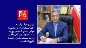 انتخاب به جا و شایسته جنابعالی به سمت معاون بازرگانی داخلی وزارت صمت را صمیمانه تبریک عرض میکنیم. با عنايت به اينكه اراده مقام عالي وزارت صمت بر بهرهمندي بيش از پيش ازمجموعه توانايي، تعهد و تجربه جنابعالي واقع گرديده است، مطمئناٌ مدیریت اثر بخش و توانمند توأم با تجارب برجسته و گرانقدرتان و همفکری همه نیروهای متخصص و متعهد و بهرهبرداری از همه تجربیات گذشته موجبات ارتقاء و توسعه همه جانبه این مجموعه عظیم را فراهم خواهد نمود.